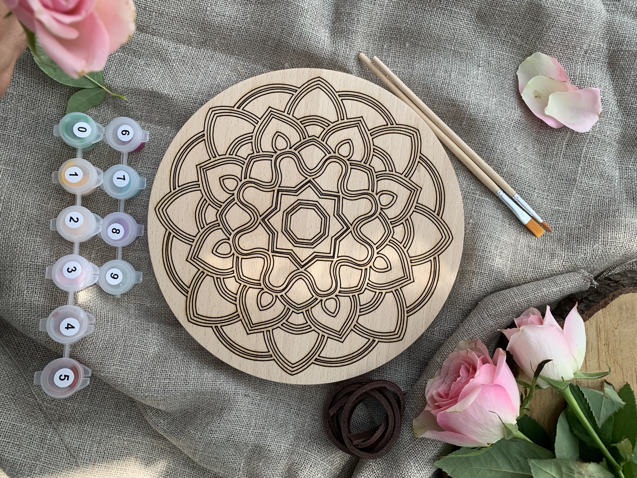 Uwaga: Słoje na drewnie a także kolory akcesoriów, takich jak pędzelki, rzemyki mogą się różnić w każdym zestawie, co dodaje unikalności każdemu produktowi.